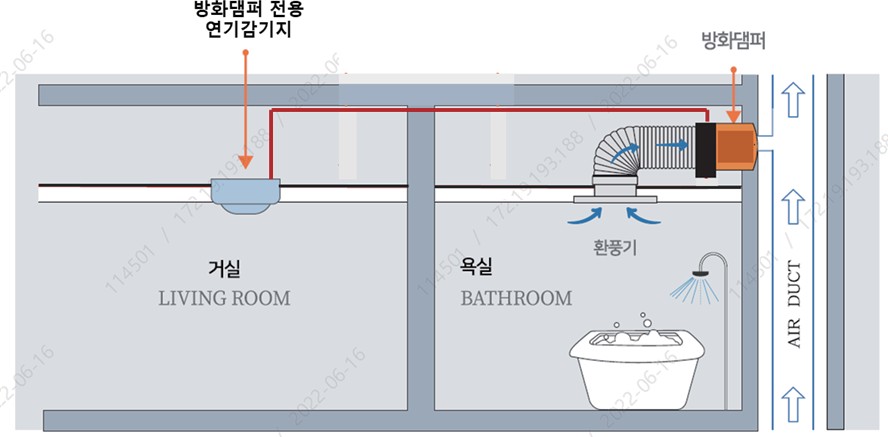 | 동작구성 및 설치 | 욕실 인근 거실등에 개별 연기감지기를 설치하여 댐퍼 컨트롤러와 연결 |